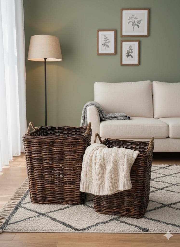 In deze rustgevende woonkamer brengen de twee donkere rotan manden een prachtig, warm contrast aan. De verschillende formaten maken ze veelzijdig in gebruik; terwijl de grotere mand nog leeg is, herbergt de kleinere al een knusse, grofgebreide plaid. Hun robuuste textuur vormt de ideale aanvulling op de zachte materialen van de bank en het tapijt, voor een harmonieus en opgeruimd geheel.