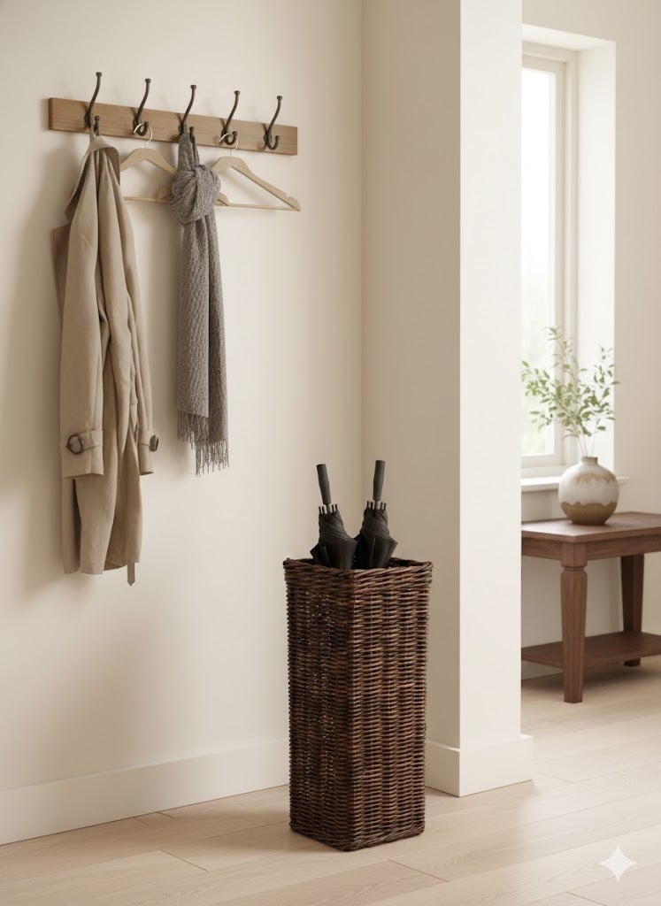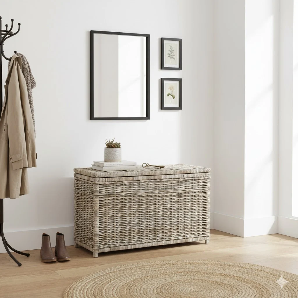 Deze sfeervolle rotan opbergmand brengt direct een warme, natuurlijke uitstraling in je hal. Dankzij de ruime opbergruimte en het stevige deksel is hij ideaal om spullen netjes uit het zicht te houden, terwijl hij tegelijkertijd fungeert als een prachtig decoratief oppervlak. Het is de perfecte combinatie van functionaliteit en design die zorgt voor een rustig en opgeruimd welkom zodra je de deur binnenstapt.