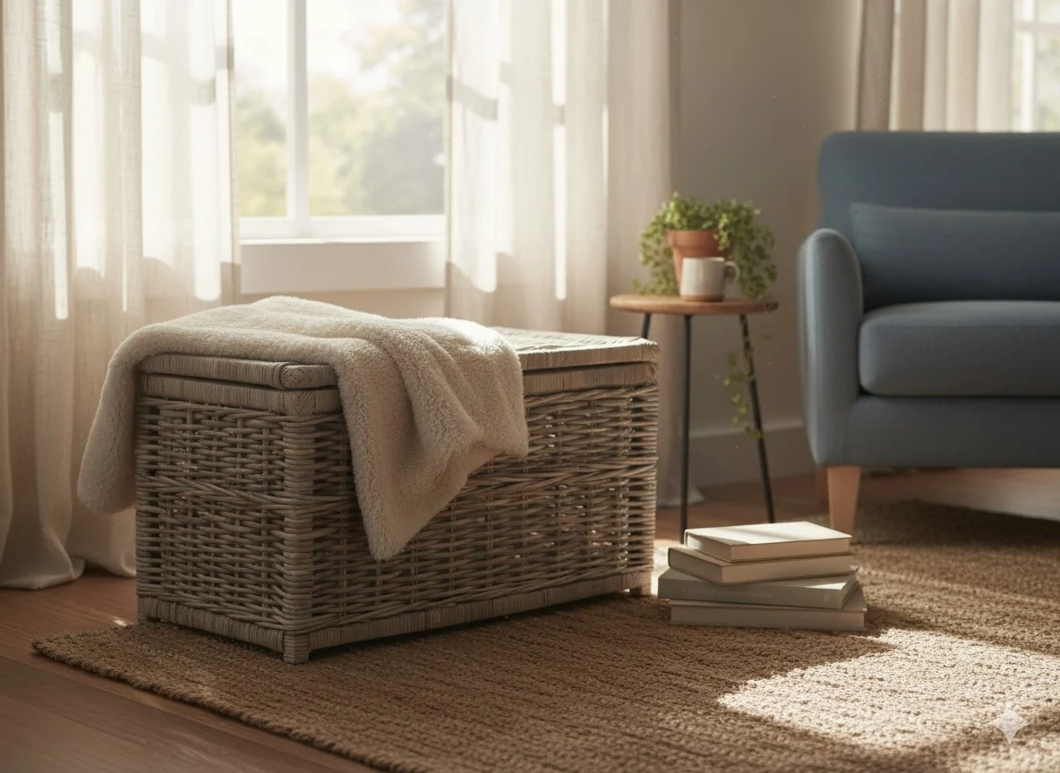 In deze knusse leeshoek wordt de rotan mand een multifunctioneel pronkstuk dat direct rust uitstraalt. Hij fungeert hier niet alleen als praktische opberger voor een extra dekentje, maar ook als een stijlvolle, handige bijzettafel voor je stapel favoriete boeken. Met zijn zachte tint en natuurlijke textuur vormt hij het perfecte, uitnodigende rustpunt naast de comfortabele stoel.
