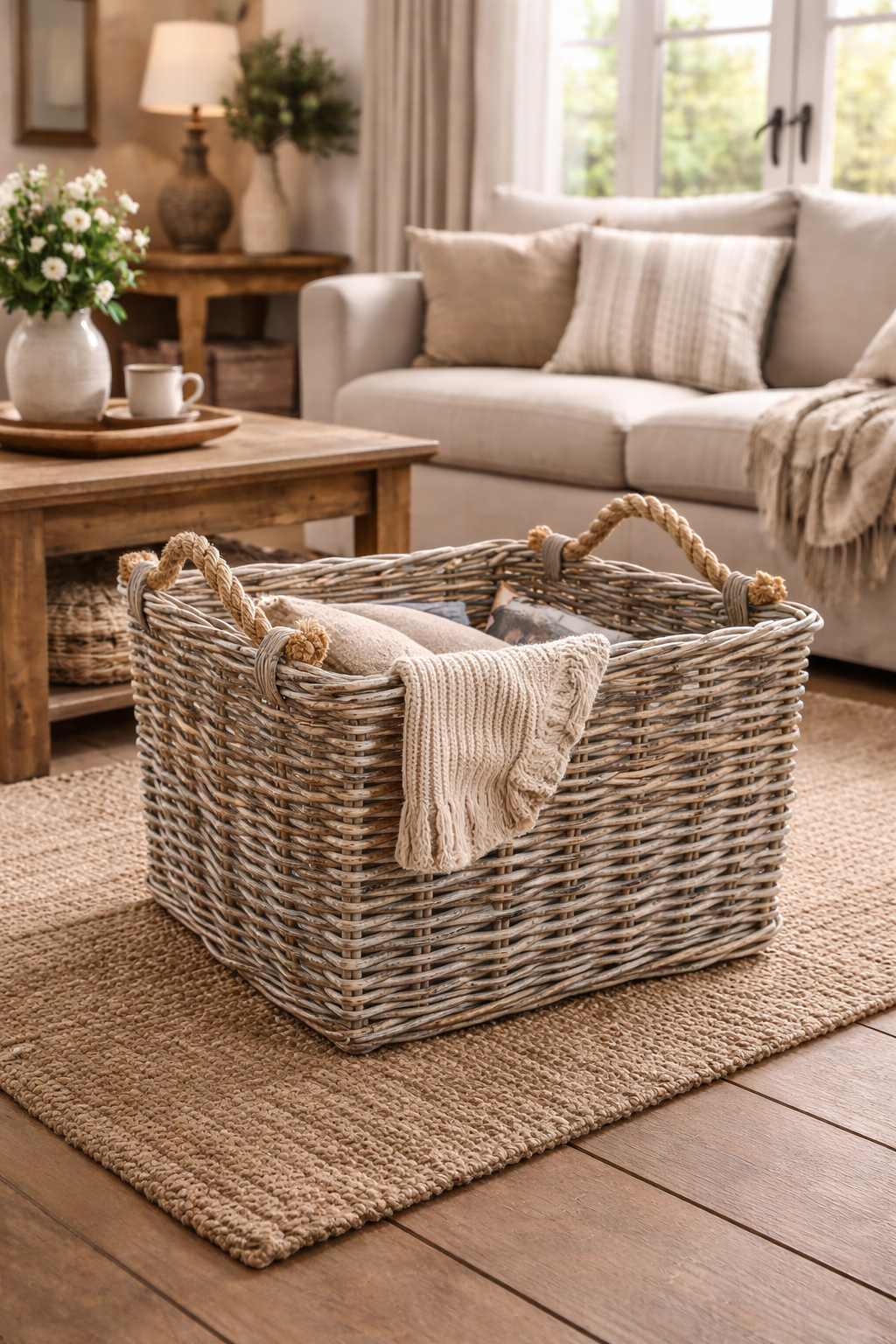 Deze prachtige, grijs-getinte rotan mand met stoere touw-handvaten voegt direct een vleugje landelijke elegantie toe aan je interieur. Hij is de ultieme opbergoplossing, perfect gevuld met een selectie zachte kussens en een warme plaid om je woonkamer georganiseerd en knus te houden. Met zijn verweerde look en robuuste ontwerp vormt de mand een stijlvol middelpunt op het natuurlijke jutte tapijt, passend bij de tijdloze, rustieke charme van de ruimte.