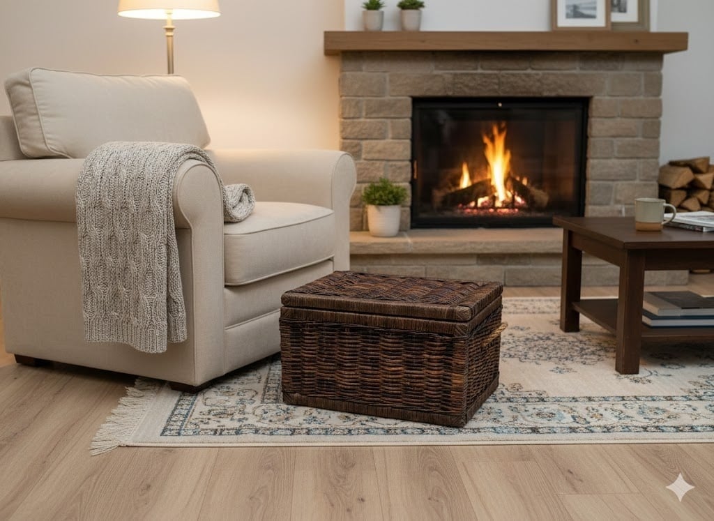 Deze donkere, rieten opbergkist vormt een sfeervolle toevoeging naast je favoriete fauteuil en de knisperende open haard. De diepe kleur van het rotan biedt een elegant contrast in de ruimte, terwijl het praktische deksel ervoor zorgt dat je spullen zoals extra plaids of tijdschriften netjes uit het zicht blijven. Het is de perfecte finishing touch voor een warme en georganiseerde woonkamer waar je heerlijk tot rust kunt komen.